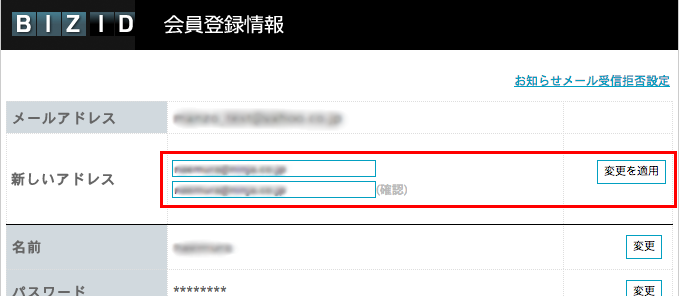 上下共に新しいメールアドレスを入力し『変更を適用』ボタンをクリック